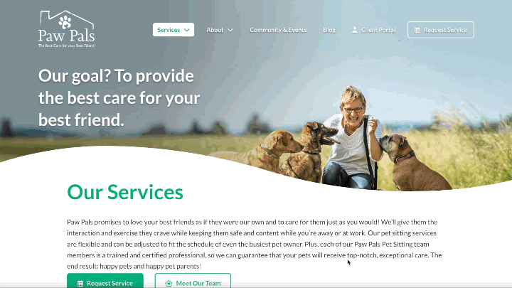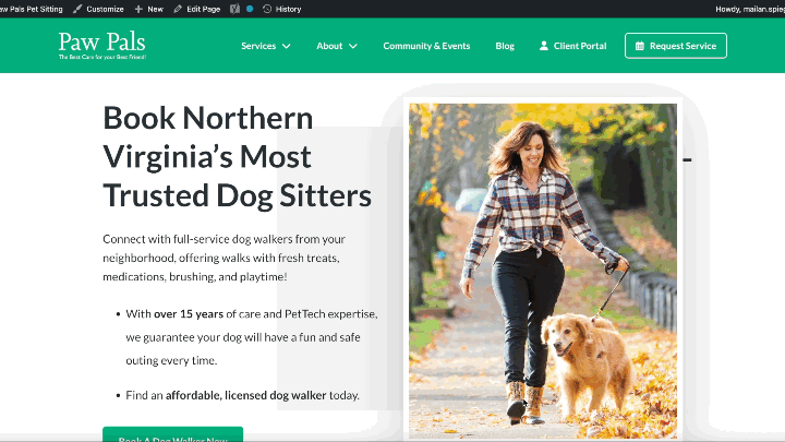 Landing Page & UX Optimization - Create custom landing page with embedded booking form and strong CTA anchor text to increase conversion rate. Added trust elements—testimonials, Pet Tech certifications and local awards —to reassure prospective clients.